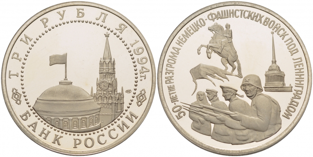 РОССИЯ 3 РУБЛЯ 1994 ЛЕНИНГРАД - ПРОРЫВ БЛОКАДЫ KM 341 медно-никель PROOF 1084-7-54