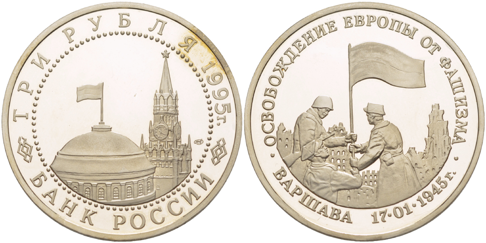 Россия 3 рубля 1995 ЛМД, освобождение Европы от фашизма. Варшава, в запайке Y 378 медно-никель PROOF 1084-7-62