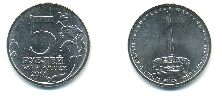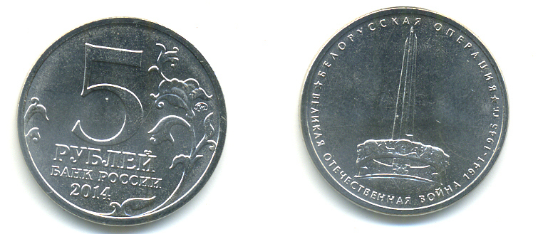 РОССИЯ 5 РУБЛЕЙ 2014 СЕРИЯ ВЕЛИКАЯ ОТЕЧЕСТВЕННАЯ ВОЙНА, БЕЛОРУССКАЯ ОПЕРАЦИЯ медь плакированная мельхиором UNC 4398-1113
