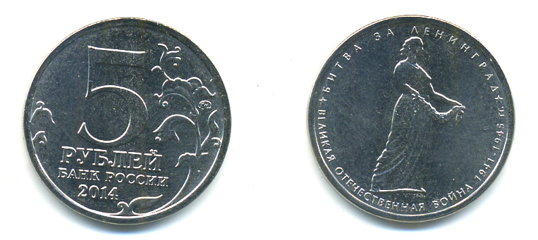 РОССИЯ 5 РУБЛЕЙ 2014 СЕРИЯ ВЕЛИКАЯ ОТЕЧЕСТВЕННАЯ ВОЙНА, БИТВА ЗА ЛЕНИНГРАД медь плакированная мельхиором UNC 4390-711