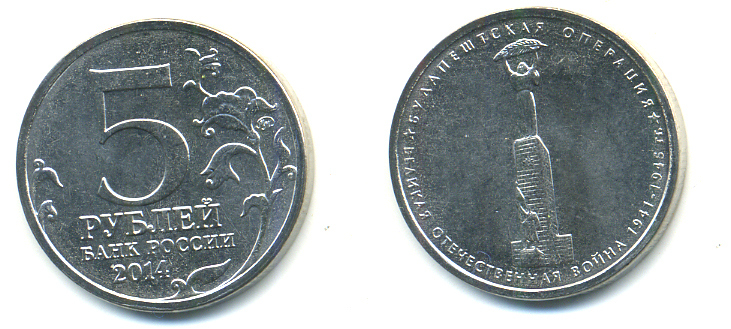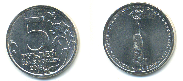 РОССИЯ 5 РУБЛЕЙ 2014 СЕРИЯ ВЕЛИКАЯ ОТЕЧЕСТВЕННАЯ ВОЙНА, БУДАПАШТСКАЯ ОПЕРАЦИЯ медь плакированная мельхиором UNC 4398-627