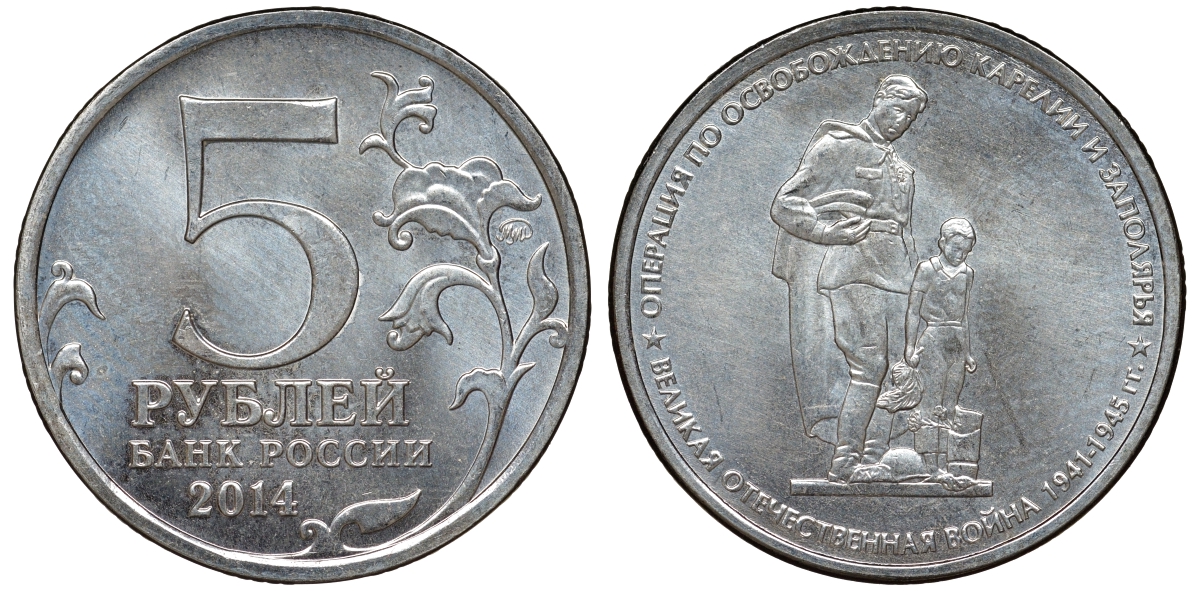 РОССИЯ 5 РУБЛЕЙ 2014 СЕРИЯ ВЕЛИКАЯ ОТЕЧЕСТВЕННАЯ ВОЙНА, ОПЕРАЦИЯ ПО ОСВОБОЖДЕНИЮ КАРЕЛИИ И ЗАПОЛЯРЬЯ медь плакированная мельхиором UNC 4398-1125