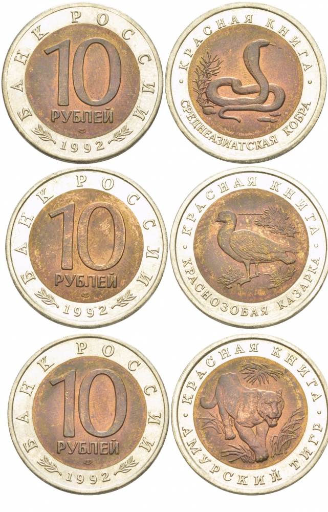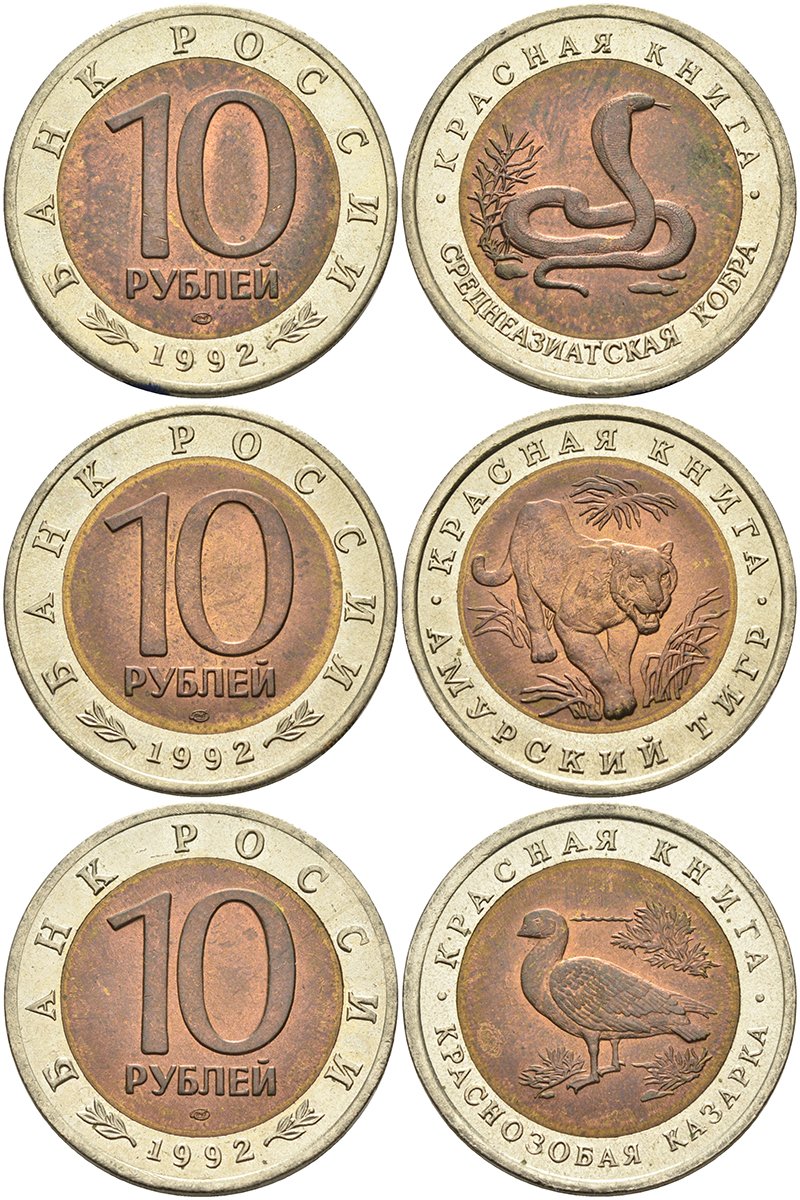 Россия лот из 3 монет по 10 рублей 1992 серия Красная книга, краснозобая казарка, амурский тигр, среднеазиатская кобра KM 307, 308, 309 биметалл UNC N6-16