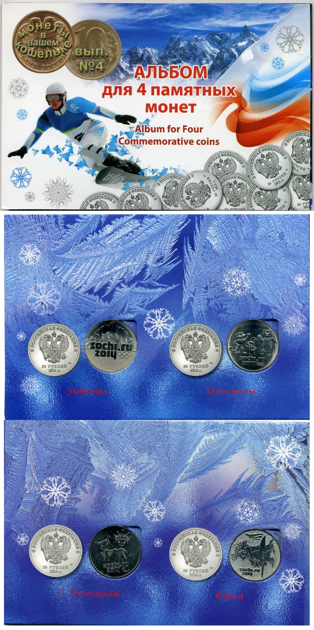 РОССИЯ НАБОР ИЗ 4 МОНЕТ 2012-2014 25 РУБЛЕЙ 2011 ЭМБЛЕМА СПМД, 25 РУБЛЕЙ 2012 ТАЛИСМАНЫ СПМД, 25 РУБЛЕЙ 2014 ЛУНТИК И СНЕЖИНКА СПМД, 25 РУБЛЕЙ 2014 ФАКЕЛ СПМД, ПОЗОЛОТА, В КАРТОННОМ АЛЬБОМЕ медно-никель UNC 3-5-2-46