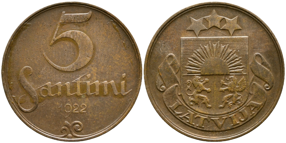 ЛАТВИЯ 5 САНТИМОВ 1922 WITH NAME, ПЕРВАЯ РЕСПУБЛИКА (1918-1939) KM 3 бронза 86-822