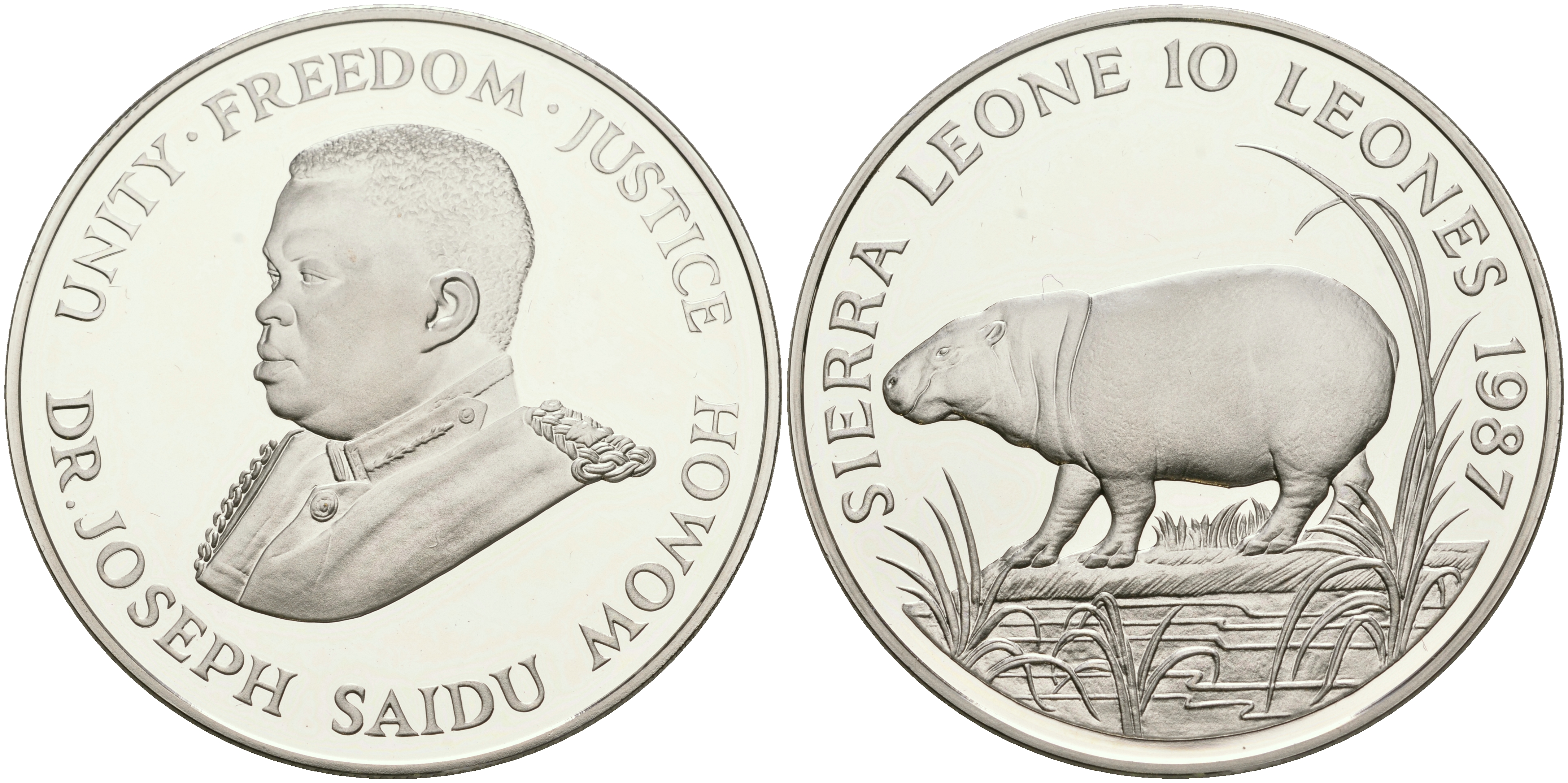 Сьерра-Леоне 10 леоне 1987 защита дикой природы, карликовый гиппопотам, доктор Джозеф Сайду Момох KM 41 серебро PROOF 1068-1-32
