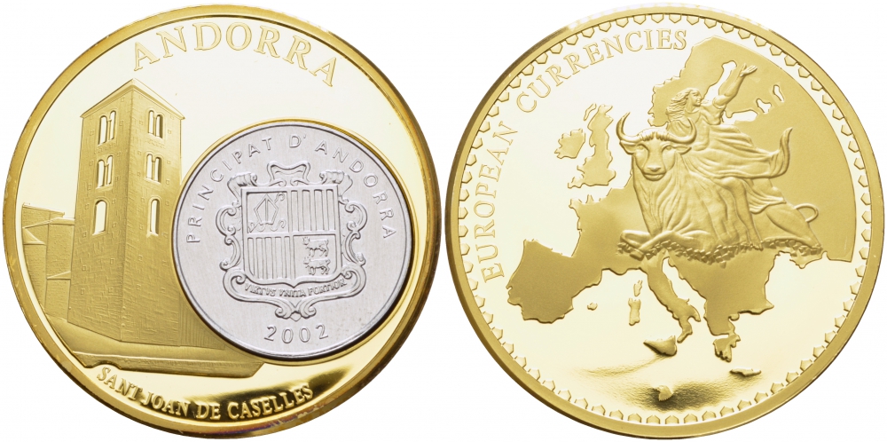 АНДОРРА МЕДАЛЬ С МОНЕТОЙ ЕВРОПЕЙСКИЕ ВАЛЮТЫ, АРХИТЕКТУРА PROOF 01-240-13