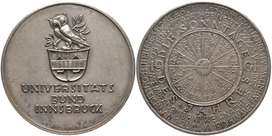 Австрия медаль 1961 серия УНИВЕРСИТЕТ ИНСБРУКА, ОТКРЫТИЯ 1961 года, медальер KOLBLINGER, диаметр 40 мм., СЕРЕБРЕНИЕ бронза 4552-231
