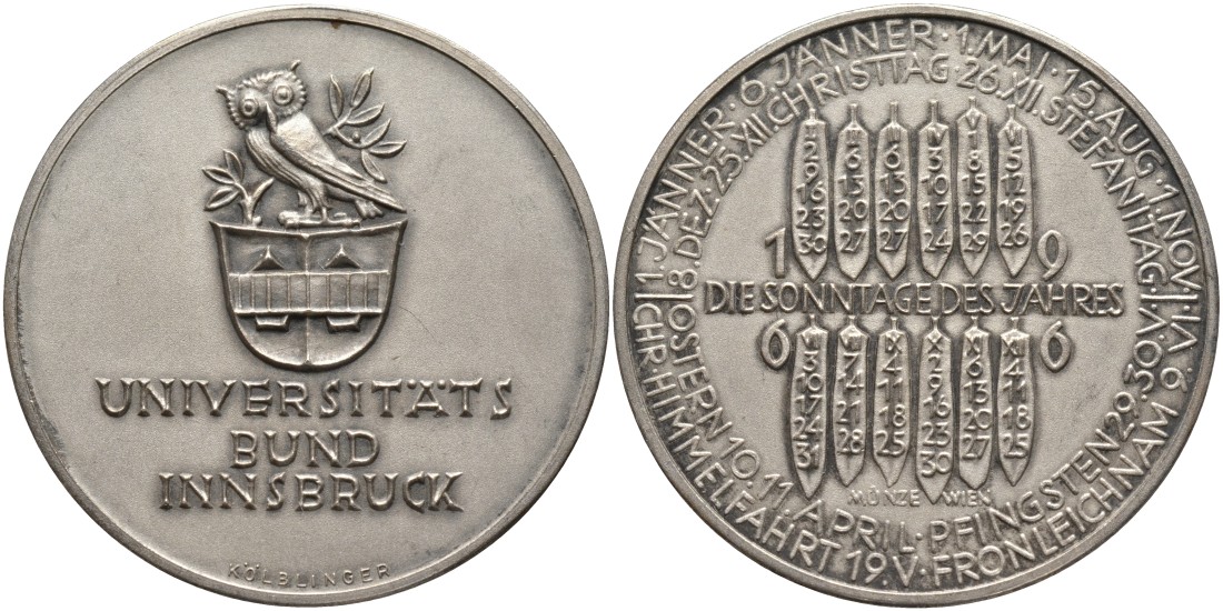 Австрия медаль 1966 серия УНИВЕРСИТЕТ ИНСБРУКА, ОТКРЫТИЯ 1966 года, медальер KOLBLINGER, диаметр 40 мм., СЕРЕБРЕНИЕ бронза 4552-234