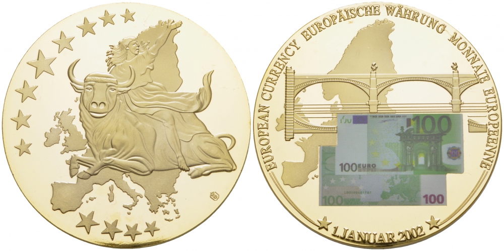ЕВРОПА МЕДАЛЬ 2002 БАНКНОТА В 100 ЕВРО НА ФОНЕ МОСТА, ДИАМЕТР 50 ММ. Вес 54 гр.позолота медно-никель PROOF 01-235-43