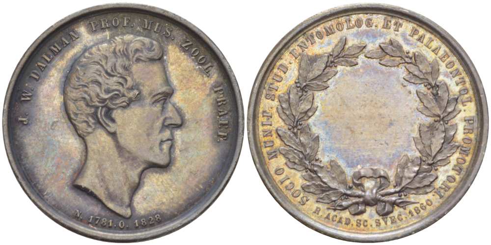 ШВЕЦИЯ МЕДАЛЬ 1860 В ПАМЯТЬ ЮХАНА ВИЛЬГЕЛЬМА ДЕЛЬМАНА (1781-1828) ШВЕДСКОГО ВРАЧА, ПРОФЕССОРА И ЭТМОЛОГА, ОТ ШВЕДСКОЙ АКАДЕМИИ, ДИАМЕТР 31 ММ., ВЕС 12,7 ГР. серебро 272-1615