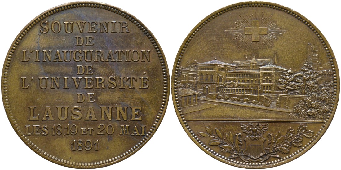 Швейцария медаль 1891 В ПАМЯТЬ ПРАЗНОВАНИЯ 18, 19, 20 МАЯ 1891 года, ИНАУГУРАЦИЯ УНИВЕРСИТЕТА ЛОЗАННЫ, диаметр 40 мм. бронза 01-148-12