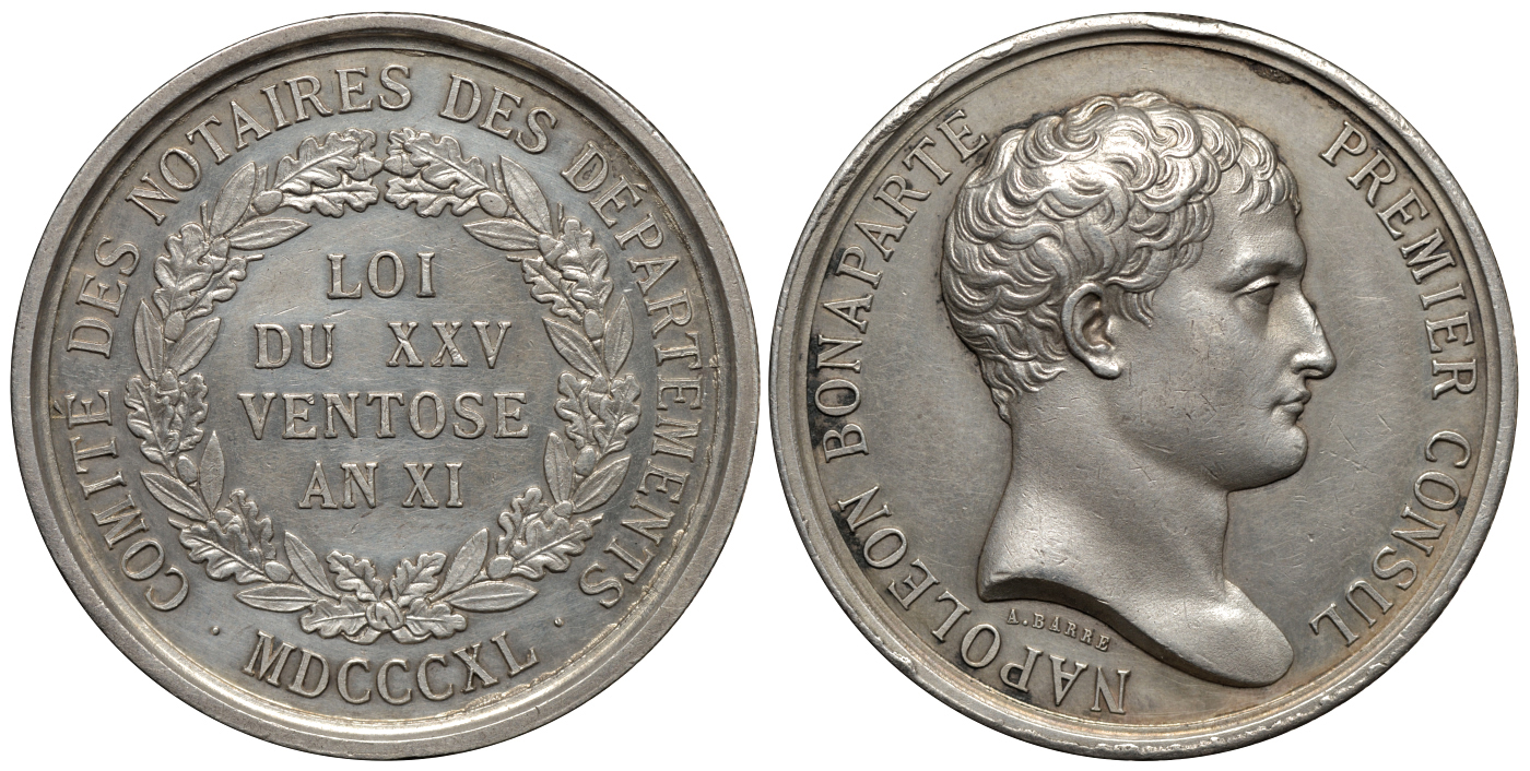 Франция медаль 1840 Наполеон Бонапарт, комитет нотариусов в департаментах, 32 мм, 13,49 гр Bramsen 1999, Slg. Julius 4030 серебро aUNC 00-801-04