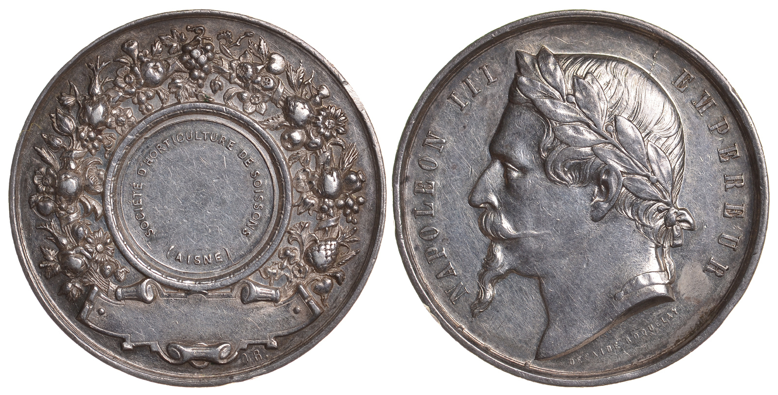 ФРАНЦИЯ МЕДАЛЬ 1870 НАПОЛЕОН III ИМПЕРАТОР, САДОВОДЧЕСКОЕ ОБЩЕСТВО ГОРОДА СУАССОН, ДЕПАРТАМЕНТ ЭНА, диаметр 37 мм., вес 18,83 гр. серебро 01-107-24