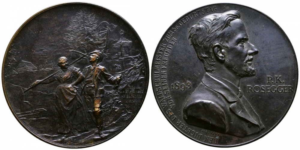 Германия медаль 1893 50 лет поэту Петеру Розеггеру, 51,0 мм, 60,45 гр. Loehr 246 бронза 11-313-44