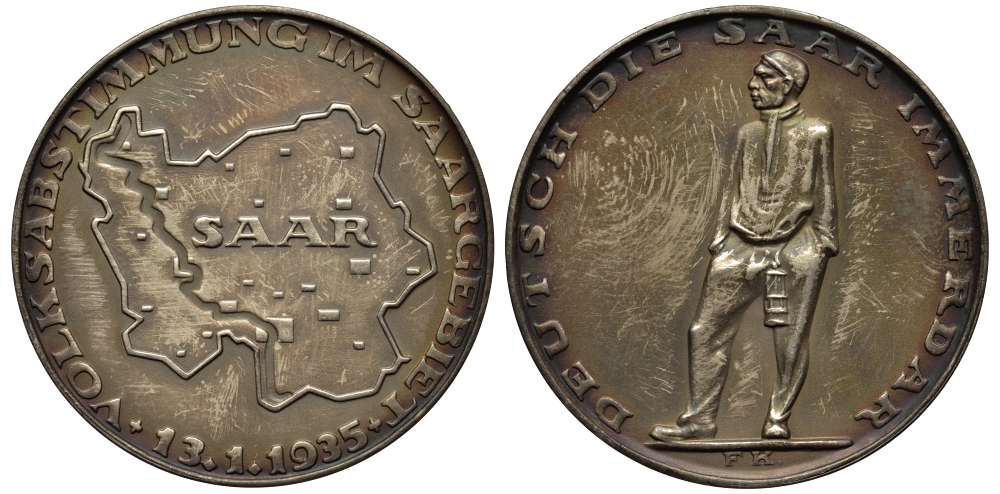 Германия медаль 1935 референдум в Саарленде, в родной коробочке, 21,7 гр, 36 мм серебро 3-4-2-27