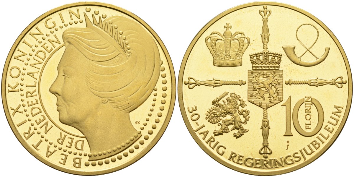 Нидерланды медаль, 10 флоринов 2010 30 лет правления королевы Беатрикс, диаметр 35 мм., позолота бронза PROOFLIKE 4558-934