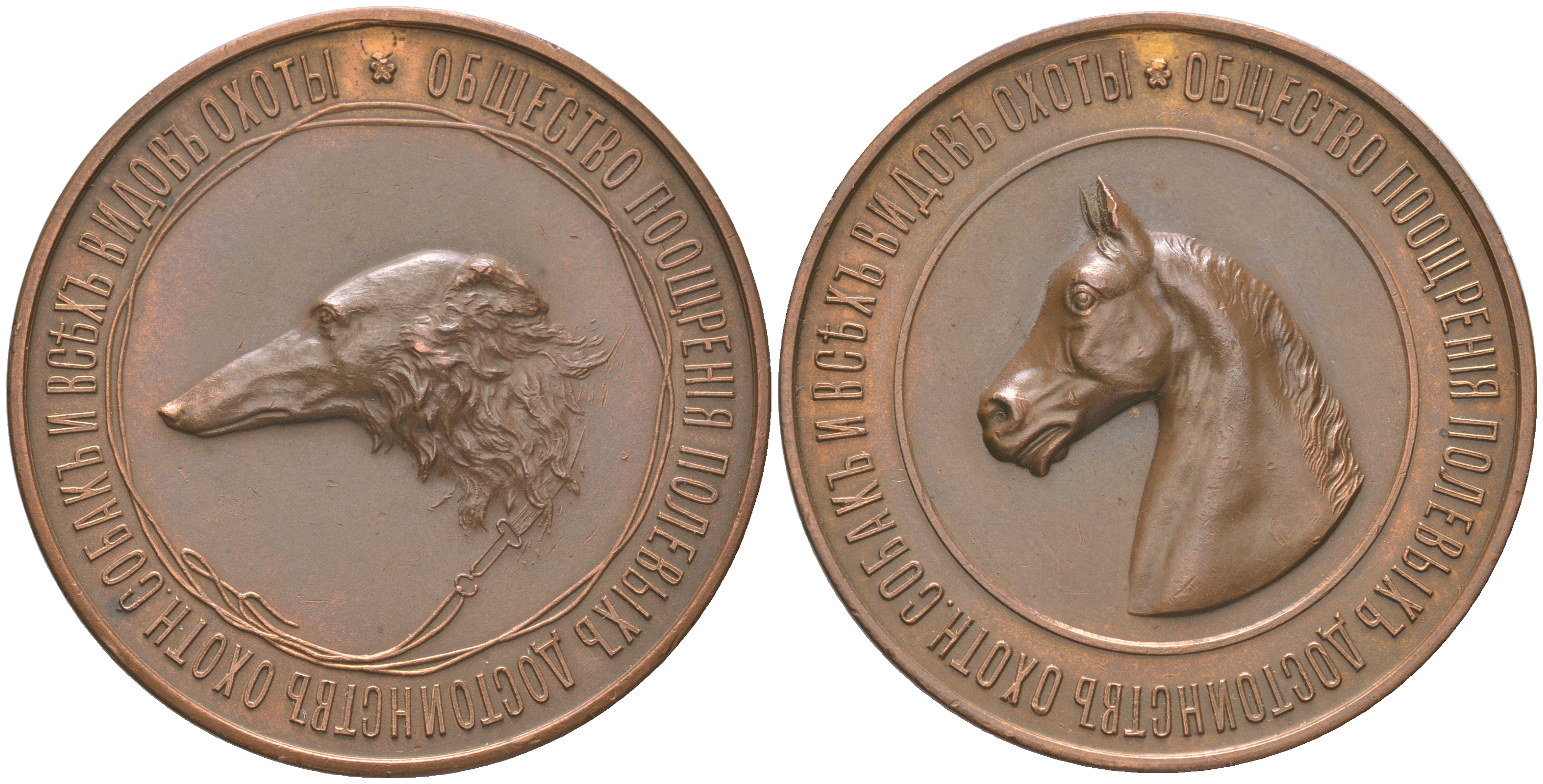 Россия медаль 1896 медаль Общества поощрения полевых достоинств охотничьих собак и всех видов охоты. СПБ, медальер С.Н. Погонов, 30,86 гр. диаметр 38,8 мм. , в верхней части медали заделано небольшое отверстие Дьяков 1228.1 (R1) бронза 1091-7-42