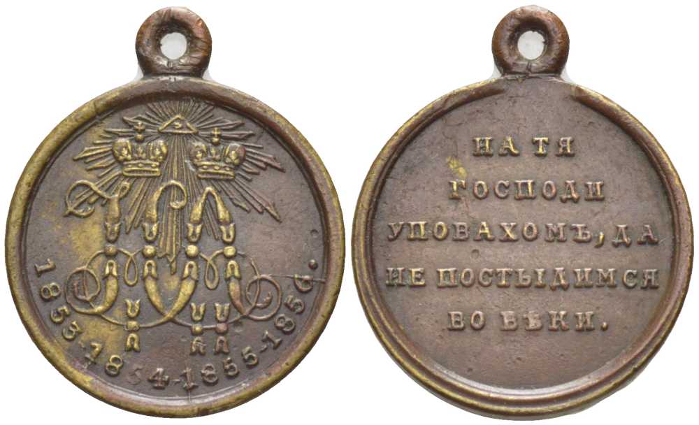 РОССИЯ ПАМЯТНАЯ МЕДАЛЬ 1856 В ПАМЯТЬ КРЫМСКОЙ (ВОСТОЧНОЙ) ВОЙНЫ (1853-1856) И ПО СЛУЧАЮ КОРОНАЦИИ АЛЕКСАНДРА II, УЧРЕЖДЕНА 26 АВГУСТА 1856 ГОДА, С УШКОМ ДЛЯ НОШЕНИЯ, ДИАМЕТР 28 ММ., ВЕС 9,26 ГР., НА ТЯ ГОСПОДИ УПОВАЕМ, ДА НЕ ПОСТЫДИМСЯ ВО ВЪКИ бронза 2222