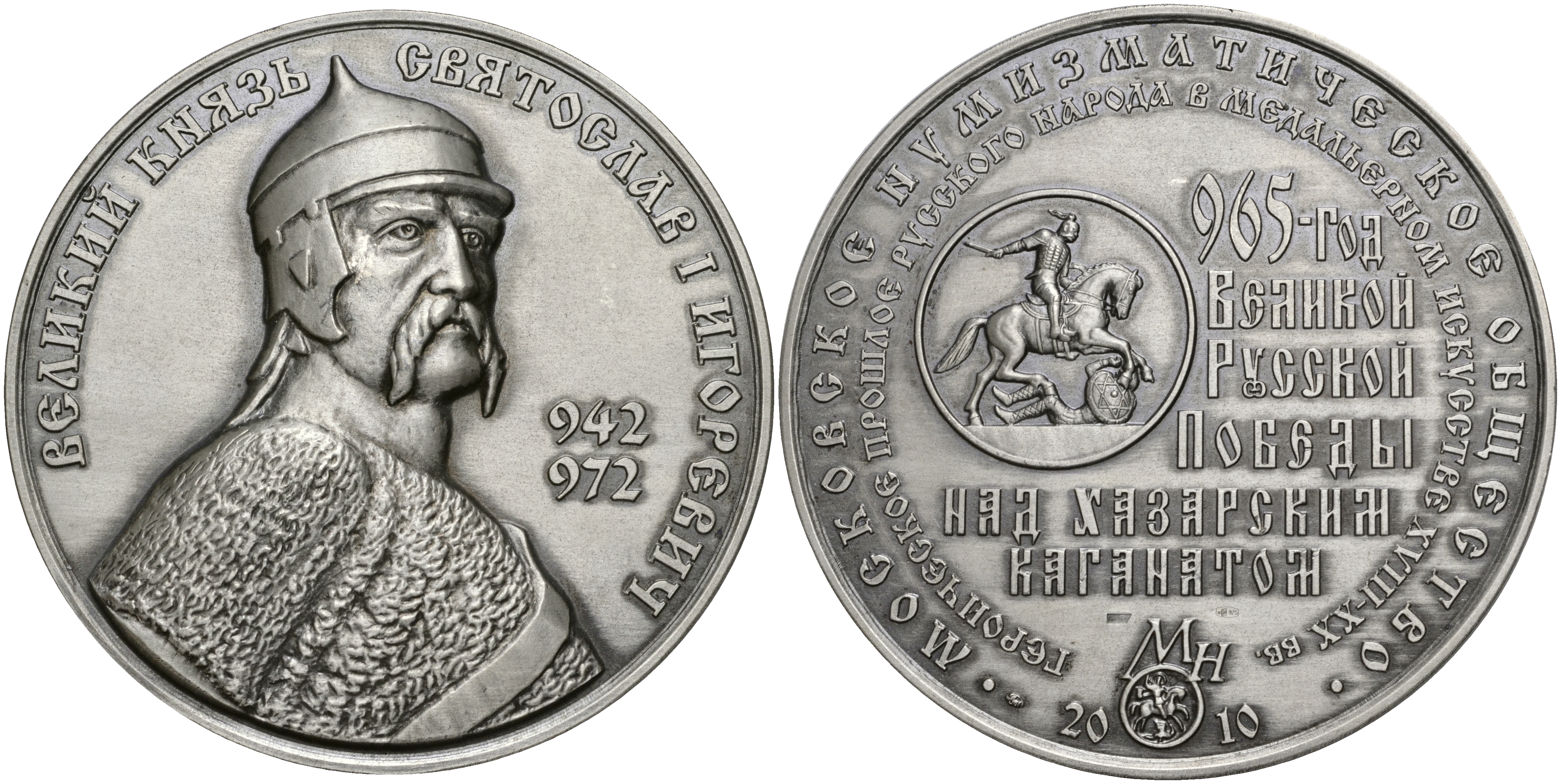 Россия медаль 2010 МНО, 925 лет победы над Хазарским каганатом, великий князь Святослав I Игоревич (942-972), ММД, диаметр 70 мм, проба 925, № 18 серебро UNC 00-705-06