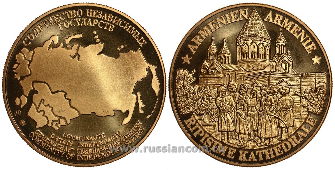 СОДРУЖЕСТВО НЕЗАВИСИМЫХ ГОСУДАРСТВ МЕДАЛЬ 1992 АРМЕНИЯ, ЦЕРКОВЬ СВЯТОЙ РИПСИМЕ, ВЕС ок. 26 ГР, ДИАМЕТР 40 ММ, ГУРТ РУБЧАТЫЙ нордик голд 5-3-1-135