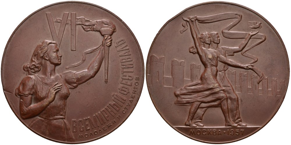 СССР медаль 1957 ЛМД, VI Всемирный фестиваль молодежи и студентов, медальер В.М. Акимушкина Шкурко, Салыков 136 томпак 00-00