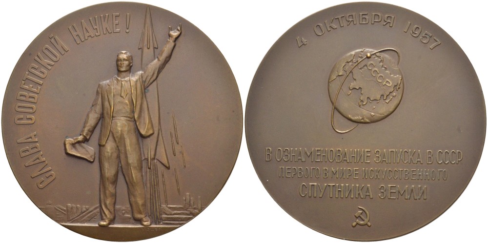 СССР медаль 1958 ЛМД, запуск в СССР первого в мире искусственного спутника земли, медальер М.Е. Эшба, диаметр 65 мм., 4 Октября 1957 года, тираж 645 экземпляров Шкурко 153 томпак 00-00
