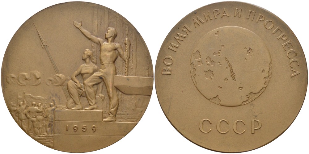СССР медаль 1960 фотографирование обратной стороны луны, медальер В.М. Акимушкина, диаметр 65 мм., ММД, межпланетная станция "ЛУНА-3", 7 Октября 1959 года Шкурко 212 томпак 01-094-22