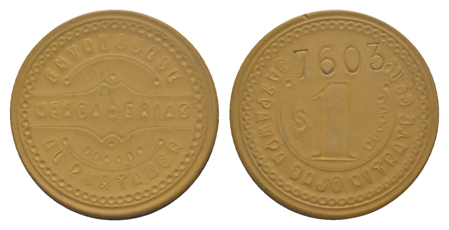 Чили, JAZPAMPA BAJO NITRATE C?.LTD, Запига (Zapiga) шахтерский жетон с Селитряного рудника для покупки в местных магазинах, номиналом в 1 песо около 1904 диаметр 20 мм, вес 2,55 гр Espinosa 145.4 эбонит (охра) 1094-3-82