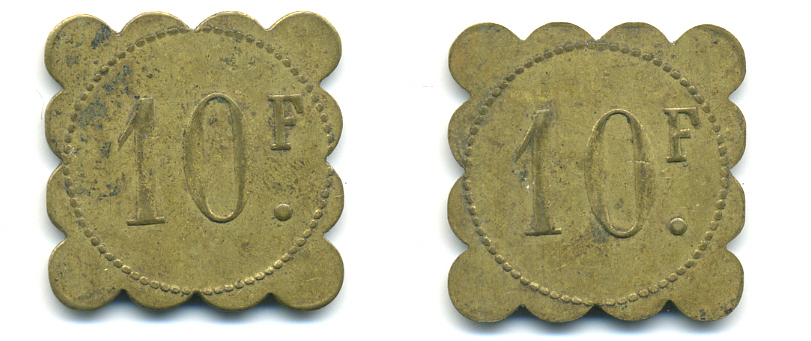 ФРАНЦИЯ 10 ФРАНКОВ НАЧАЛО XX ВЕКА 25 x 25 мм, вес около 3,85 гр., платежный жетон., платежный жетон латунь 89-1022