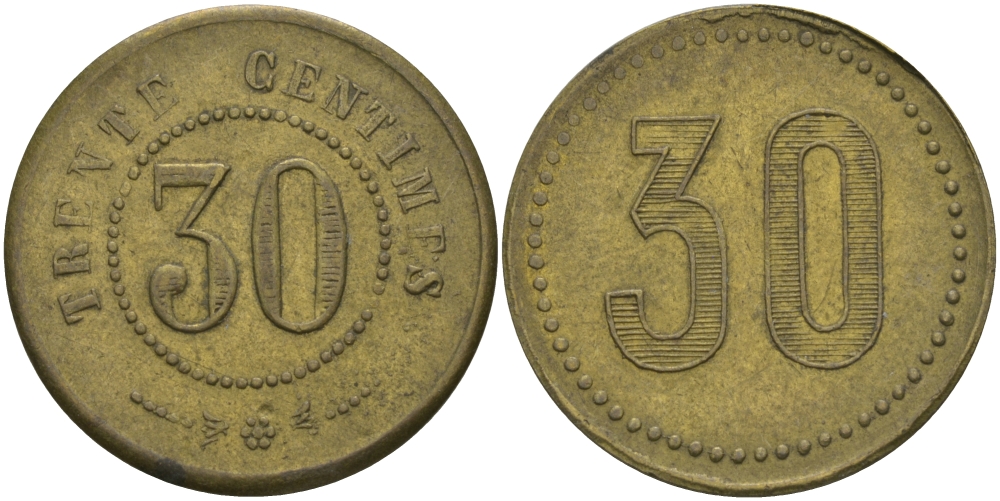 ФРАНЦИЯ 30 САНТИМОВ ND ПЛАТЕЖНЫЙ ЖЕТОН НАЧАЛА XX ВЕКА, НОМИНАЛ НА АВЕРСЕ ЦИФРАМИ И ПРОПИСЬЮ, ДИАМЕТР 24 ММ. латунь 65-336