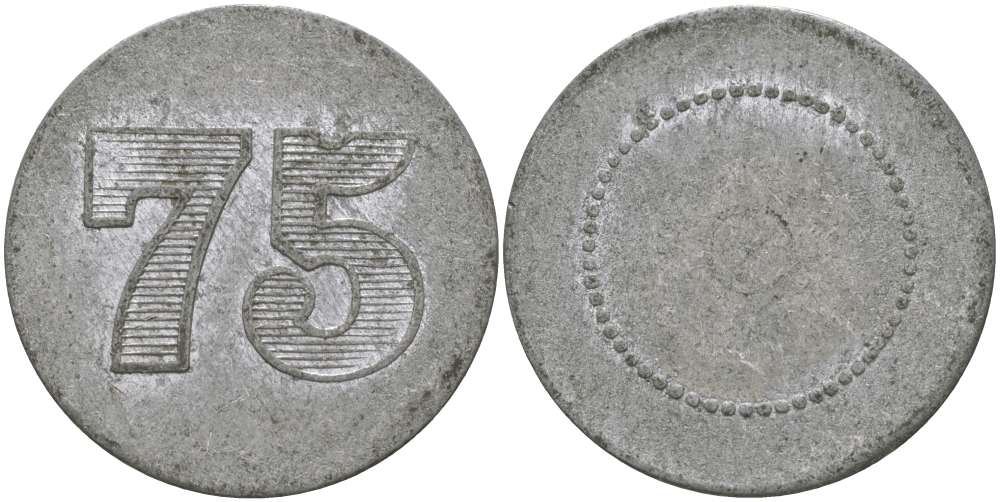 ФРАНЦИЯ 75 САНТИМОВ ND ПЛАТЕЖНЫЙ ЖЕТОН НАЧАЛА XX ВЕКА, НОМИНАЛ С ОДНОЙ СТОРОНЫ, ЦИФРЫ НОМИНАЛА 12 ММ., ДИАМЕТР 24 ММ. алюминий 65-322